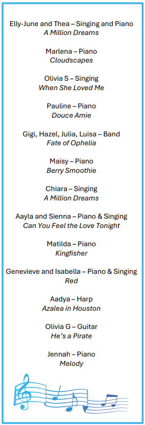 I would like to give a huge thank you to Miss Faber who helped organise and accompany the concert, as well as all of the Visiting Music Teachers that helped prepare.